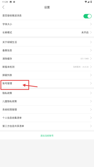 3、在设置页面,点击账号管理选项,弹出账号操作选项。