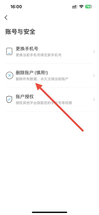 3、在账号与安全页面点击删除账户选项,进入注销账户页面。