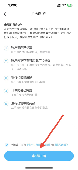 4、在注销账户页面勾选同意相关协议后,点击申请注销按钮,即可完成账户注销操作。