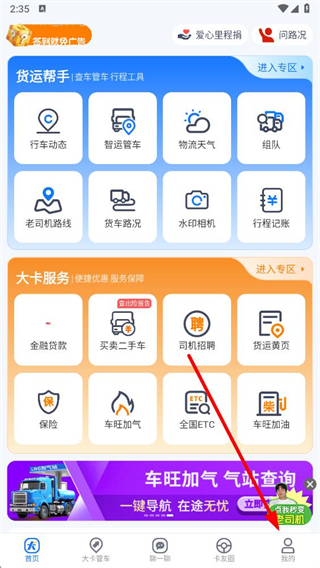 1、在车旺大卡app首页点击我的选项,进入个人页面。