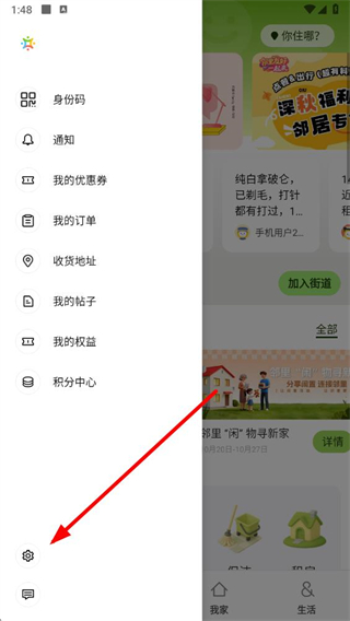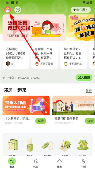 1、在住这儿app首页点击左上角头像,展开功能菜单。