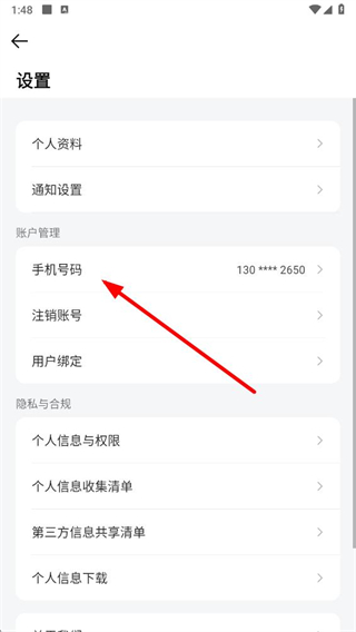 3、在设置页面点击手机号码选项,弹出更换手机号提示框。