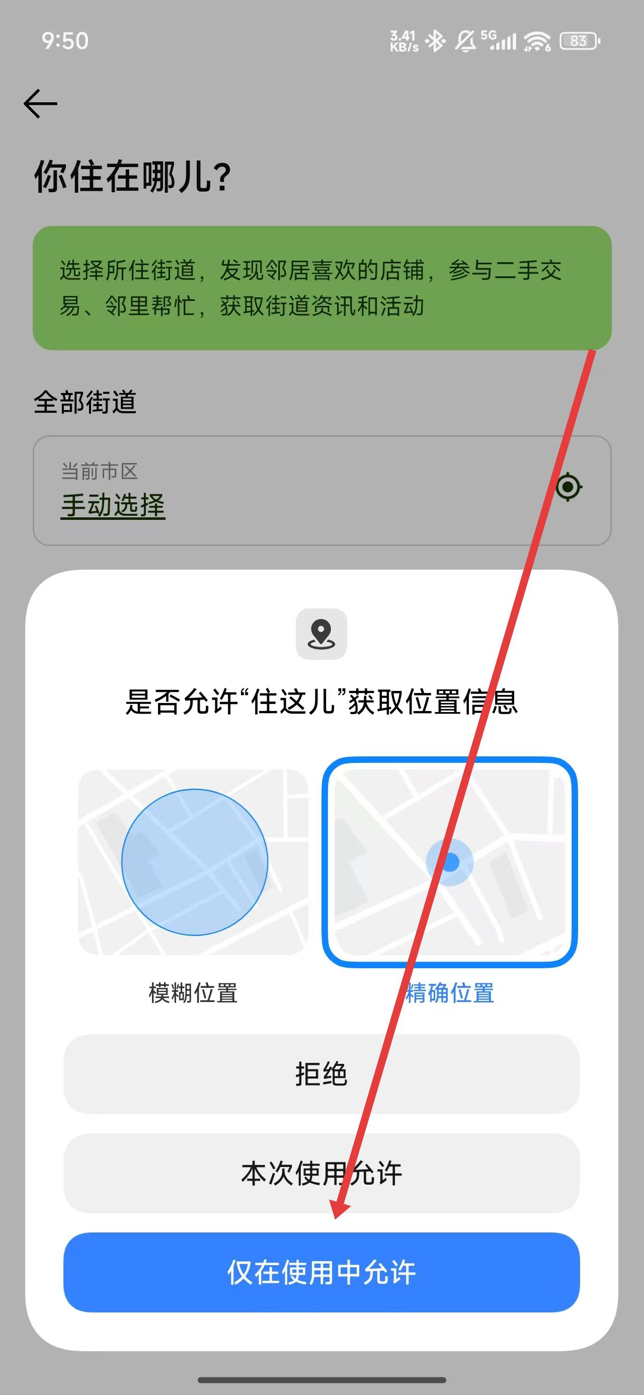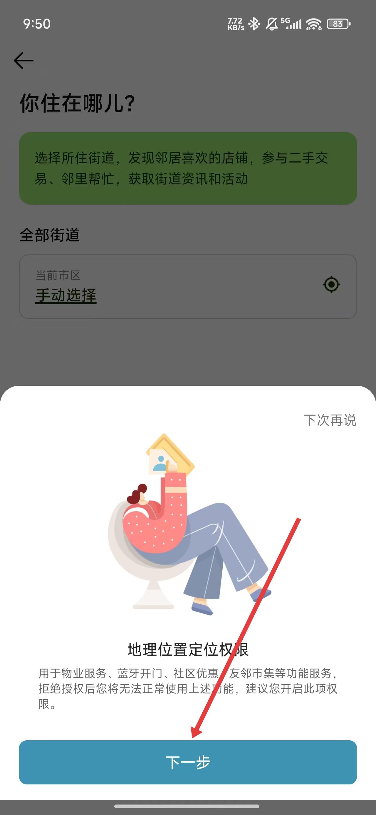 1、在进入到住这儿app后,在地理位置定位权限窗口点击下一步按钮,开启定位操作。