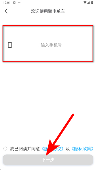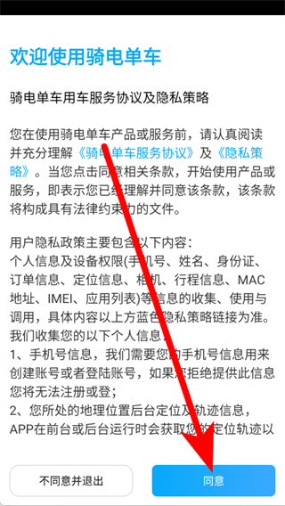 1、打开骑电单车,在服务协议及隐私策略弹窗中,点击同意。