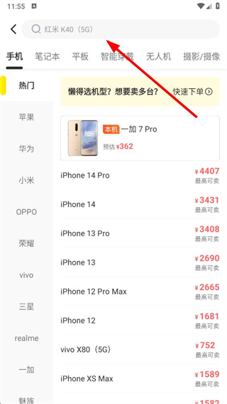 3、在机型选择页面搜索或选择要估价的机型,进入手机估价页面。