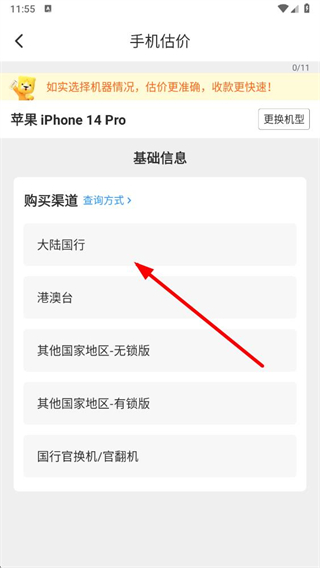 4、在手机估价页面选择购买渠道等基础信息,按提示完成后续估价流程,即可完成估价操作。