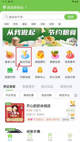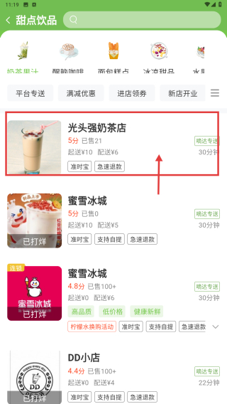 1、打开外卖类应用,点击甜点饮品分类,进入甜点饮品商品页面。