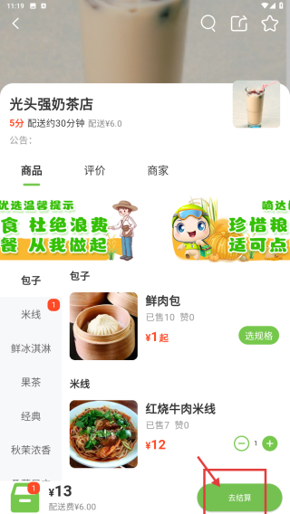 2、在甜点饮品商品页面,点击光头强奶茶店条目,进入店铺商品列表页面。
