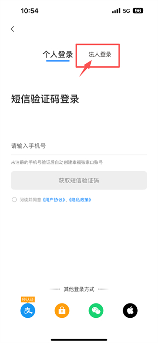 3、在登录方式选择界面,点击法人登录选项,进入法人登录页面。