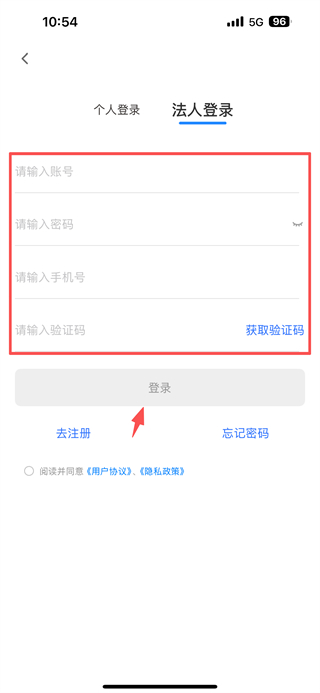 4、在法人登录页面,依次输入账号、密码、手机号,点击获取验证码并输入验证码后,点击登录按钮,完成法人登录操作。