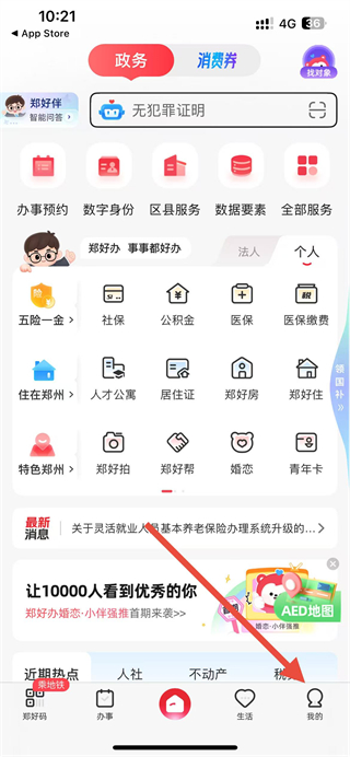 1、在郑好办app首页点击我的选项,进入个人页面。