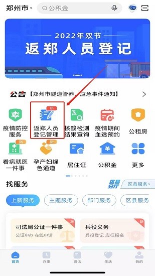 登录“郑好办”APP--返郑人员登记管理系统,如实填报个人信息。