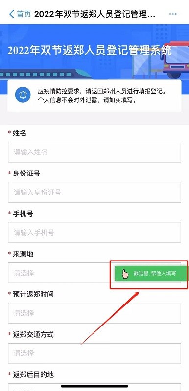 进入返郑人员登记管理系统后,点击“戳这里,帮他人填写”,即可帮他人填报个人信息。
