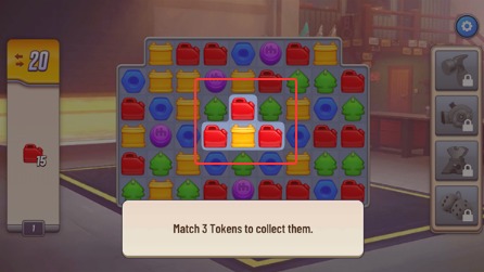 4、通过完成三消小游戏来获取维修资金,横向或纵向连成三个相同零件图案即可消除。达到左侧进度条规定的目标额度后,就能解锁新配件改装爱车。