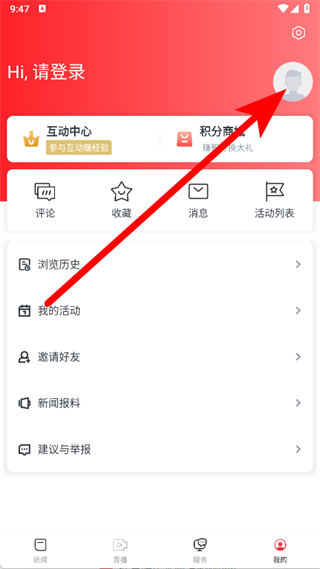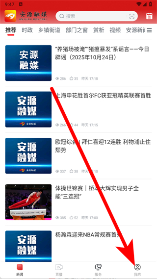 1、打开安源融媒体,点击底部导航栏的我的,进入个人中心页面。