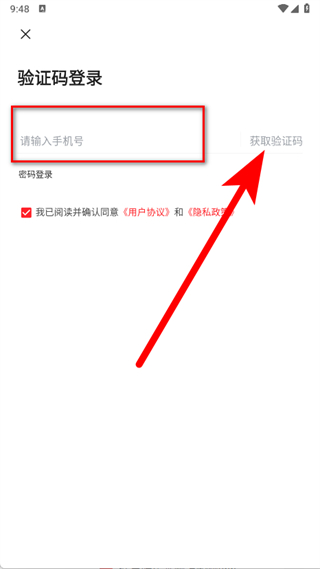 3、在验证码登录界面,输入手机号码,点击获取验证码。