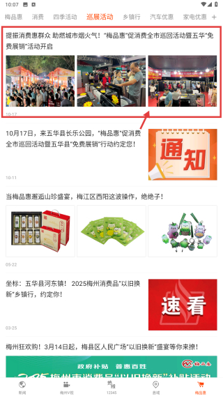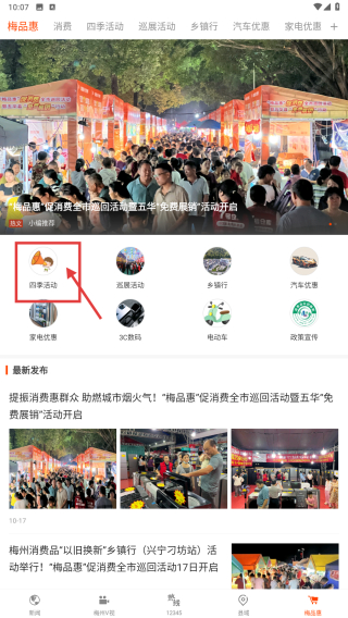 2、在梅品惠页面,点击四季活动分类,浏览巡展活动新闻列表。