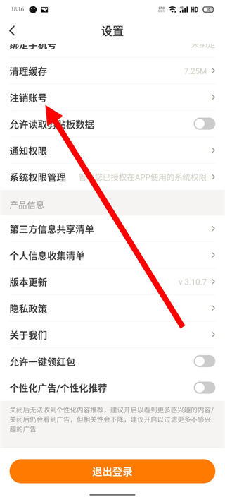 3、在设置界面中,找到注销账号选项并点击,进入注销流程页面。