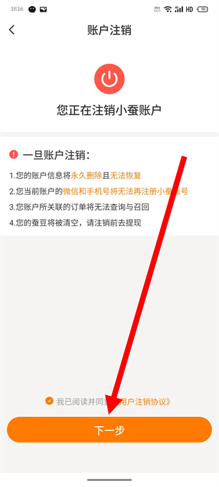 4、在账户注销页面,仔细阅读注销须知后,勾选后,点击下一步。