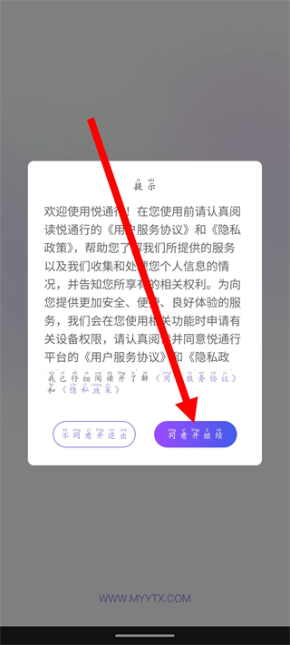 1、打开悦通行,在提示弹窗中点击同意并继续,确认阅读并同意。