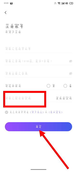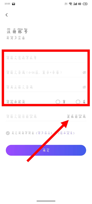 3、输入手机号、设置6-16位含数字和字母的密码,选择性别,点击获取验证码。