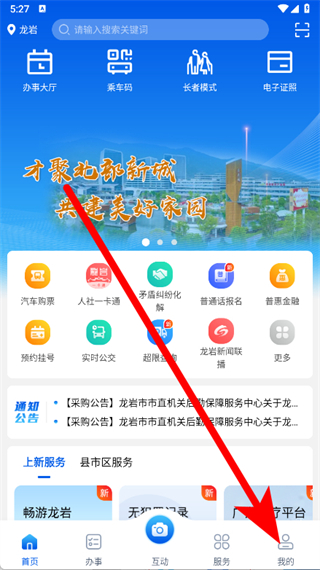 1、打开e龙岩,点击底部导航栏的我的,进入个人中心页面。