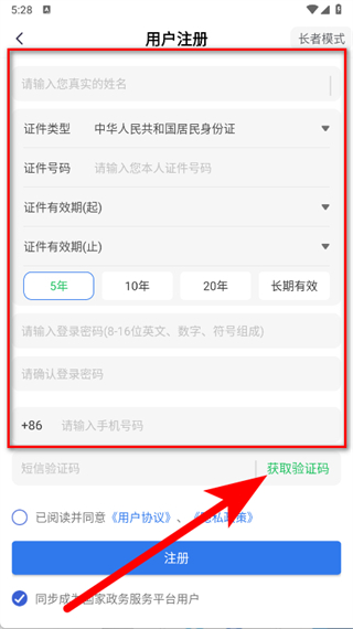 4、依次填写真实姓名、证件类型及号码、登录密码、手机号码等信息,点击获取验证码。