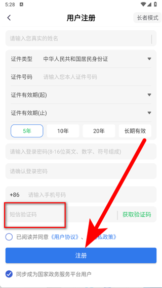 5、输入收到的短信验证码,勾选后,点击注册按钮,完成账号注册。