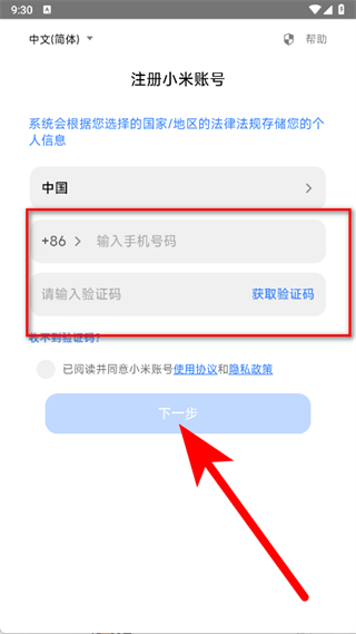 4、输入手机号码,点击获取验证码并填写收到的短信验证码,勾选后,点击下一步,完成注册。