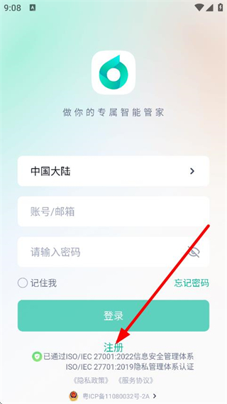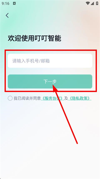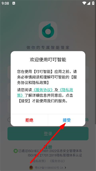 1、在欢迎使用叮叮智能弹窗中,点击接受,进入登录注册页面。