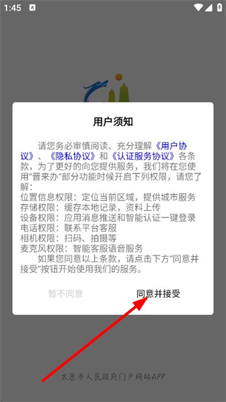 1、在用户须知弹窗中,点击同意并接受,进入APP首页。