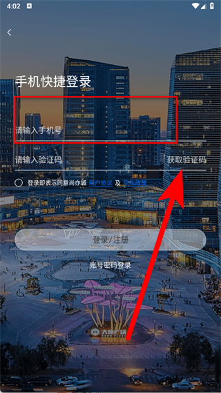 3、在登录界面,输入手机号码,点击获取验证码。
