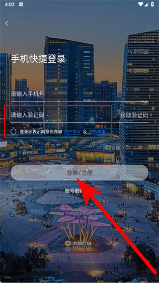 4、输入收到的短信验证码,勾选后,点击登录注册按钮,完成注册登录。