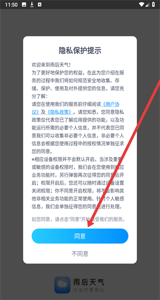 1、在雨后天气的“隐私保护提示”弹窗点击“同意”,进入福州市天气主界面。