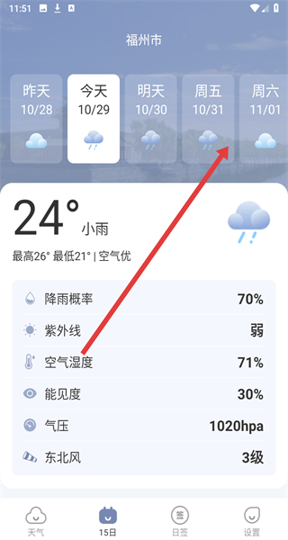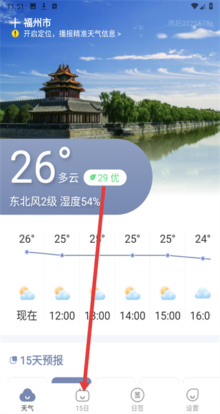 2、在福州市天气主界面点击底部“15日”,进入15日预报页面。