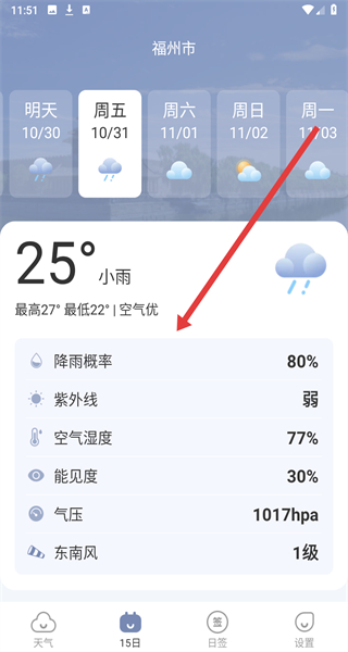3、在15日预报页面点击“周五10/31”,切换到10月31日天气界面。