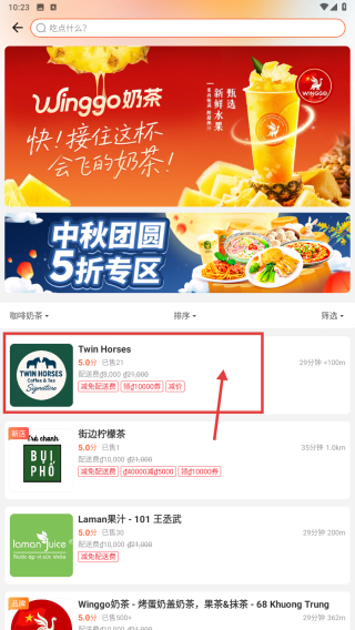 2、在商家列表页面,点击Twin-Horses商家条目,进入商家商品页面。