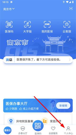 1、在江苏医保云app医保云页面点击个人中心选项,进入登录页面。