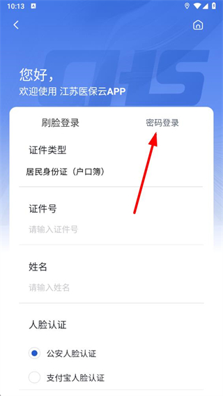 2、在登录页面点击密码登录选项,进入密码登录页面。