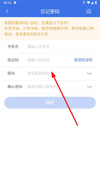 4、在忘记密码页面输入手机号,输入验证码,设置密码,点击确定按钮,即可完成密码重置操作。