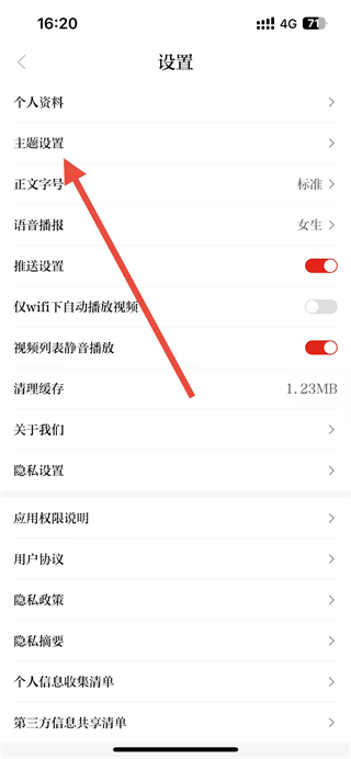 3、在设置页面点击主题设置选项,进入主题设置页面。