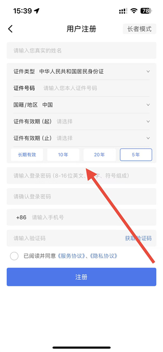 4、在用户注册页面填入信息后,勾选同意服务协议、隐私协议,点击注册按钮,即可完成账号注册。