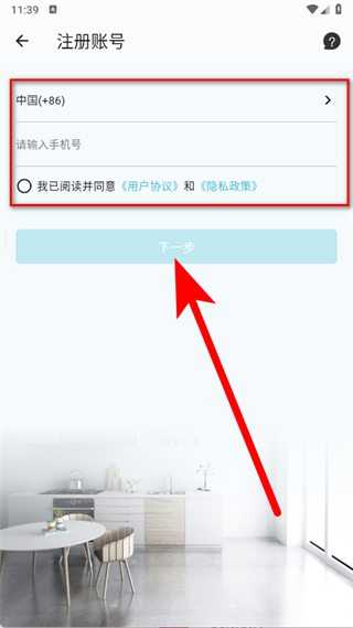 3、在注册账号页面,选择地区、输入手机号,勾选协议后点击下一步。