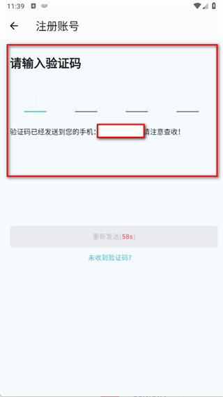 4、在验证码页面,输入收到的验证码,完成账号注册。