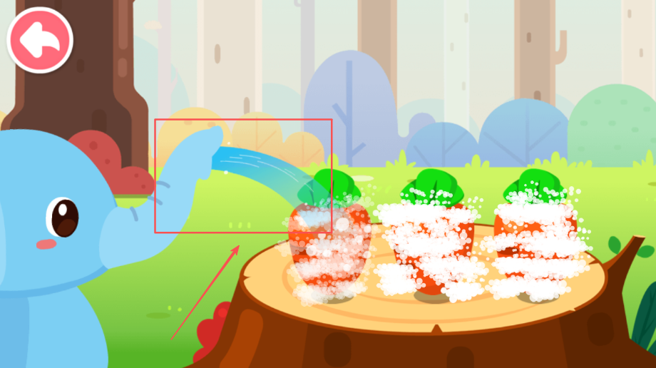 2、然后对食材进行加工处理,用鳄鱼牙齿切香蕉块,请大象和面,让啄木鸟帮忙打开硬壳。