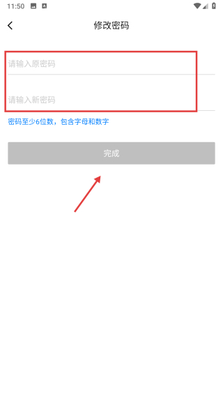 4、在修改密码页面,输入原密码和新密码密码至少6位数,包含字母和数字,点击完成按钮,完成密码修改操作。