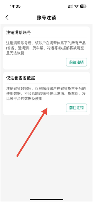 4、在账号注销页面,选择仅注销省省数据或注销满帮账号,点击对应的前往注销按钮即可进行注销操作。