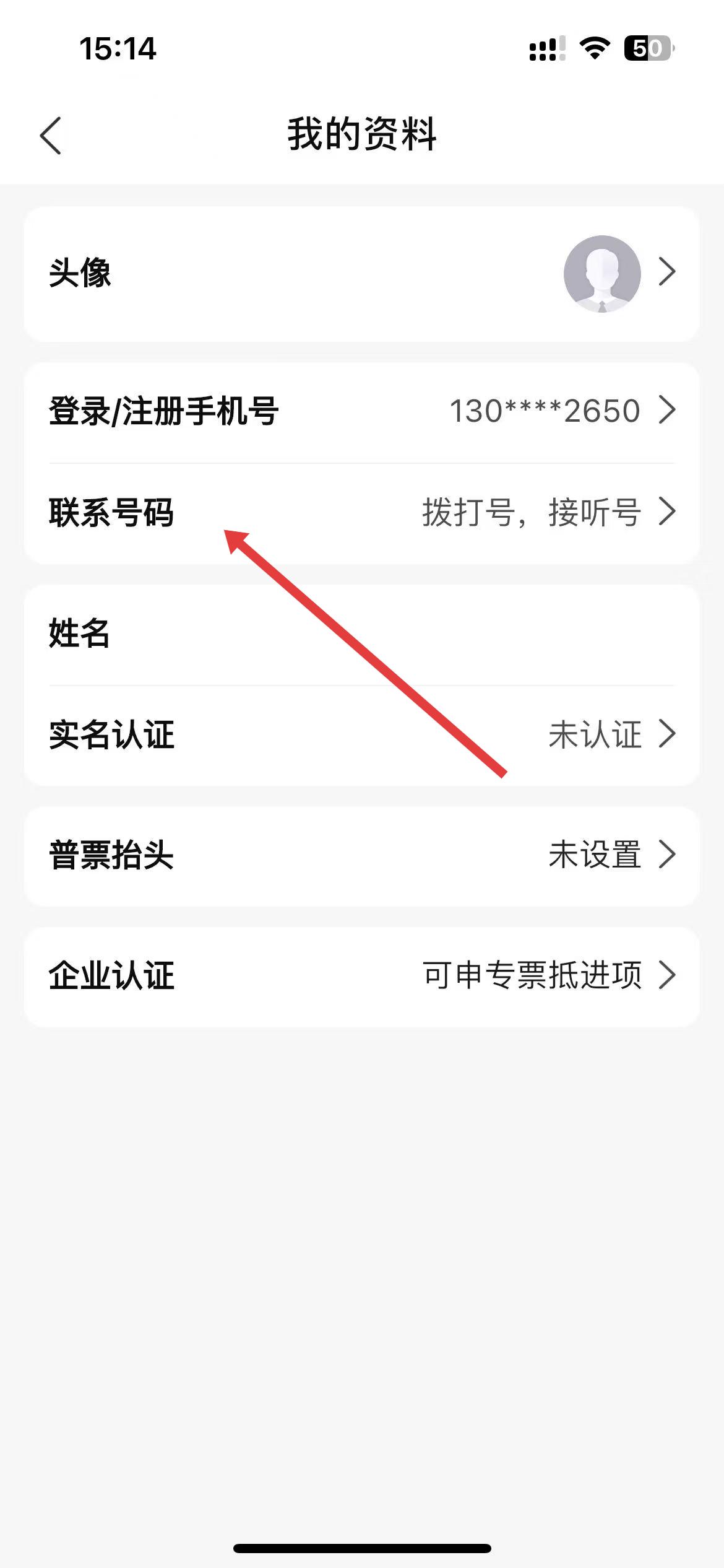 3、在我的资料界面里,找到联系号码选项并点击,进入号码管理界面。