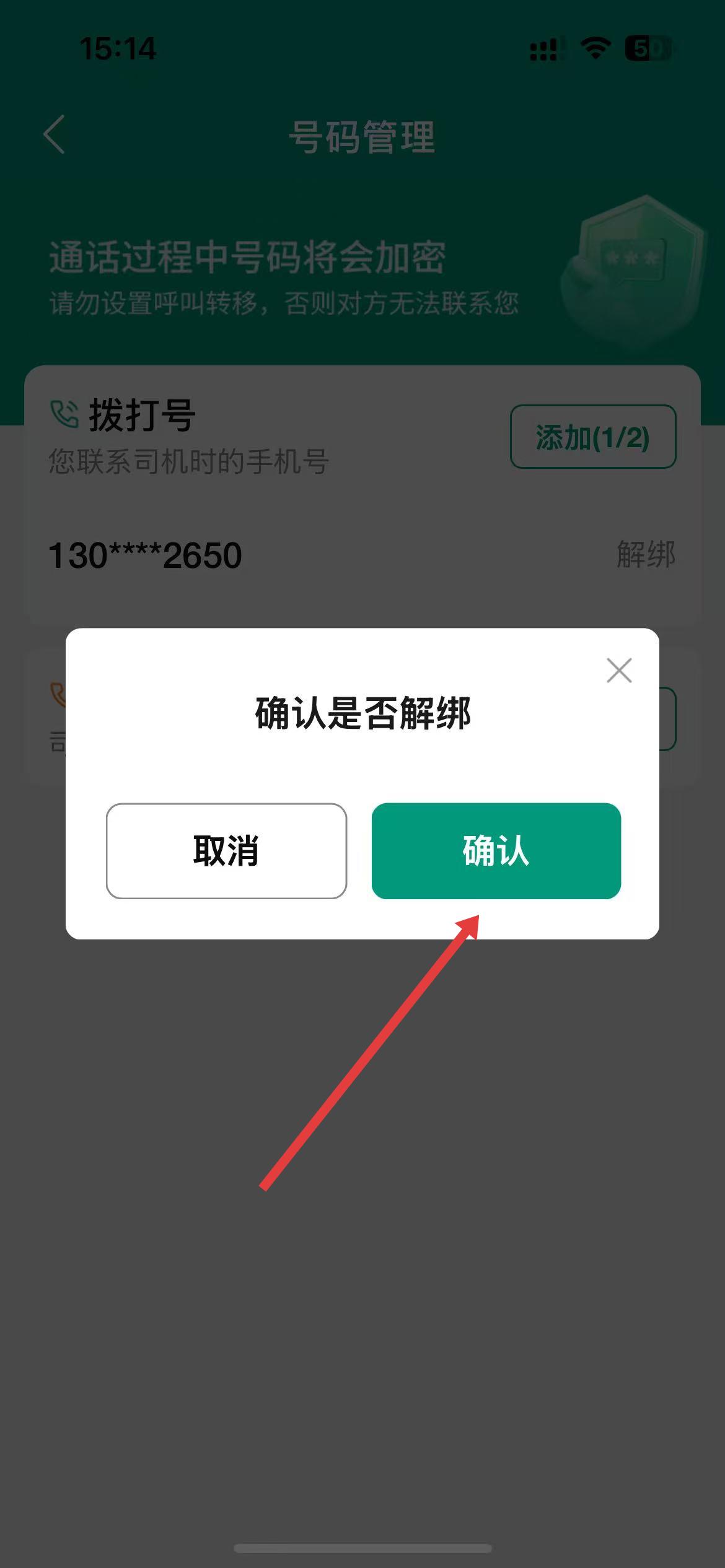 5、在弹出的确认是否解绑的提示框中,点击确认,即可完成号码解绑操作。
