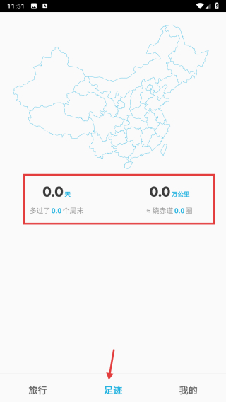 3、点击底部足迹选项,查看行程数据如天数、公里数等。